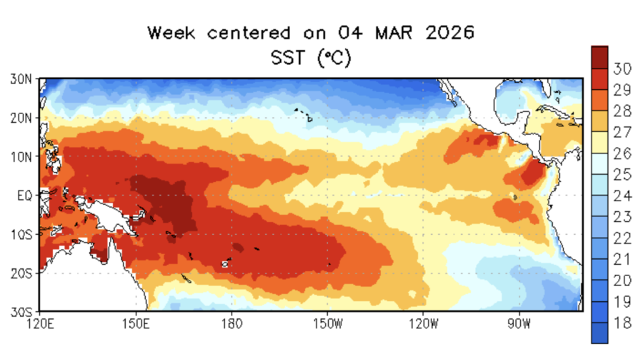 A principios de año, el agua superficial se mantenía fría —registrando -0.5°C en enero y bajando sorpresivamente a -0.9°C en el reporte de febrero—. Sin embargo, el informe de marzo revela que el aumento abrupto en las probabilidades de El Niño está respaldado por «una gran cantidad de calor en la subsuperficie del océano».